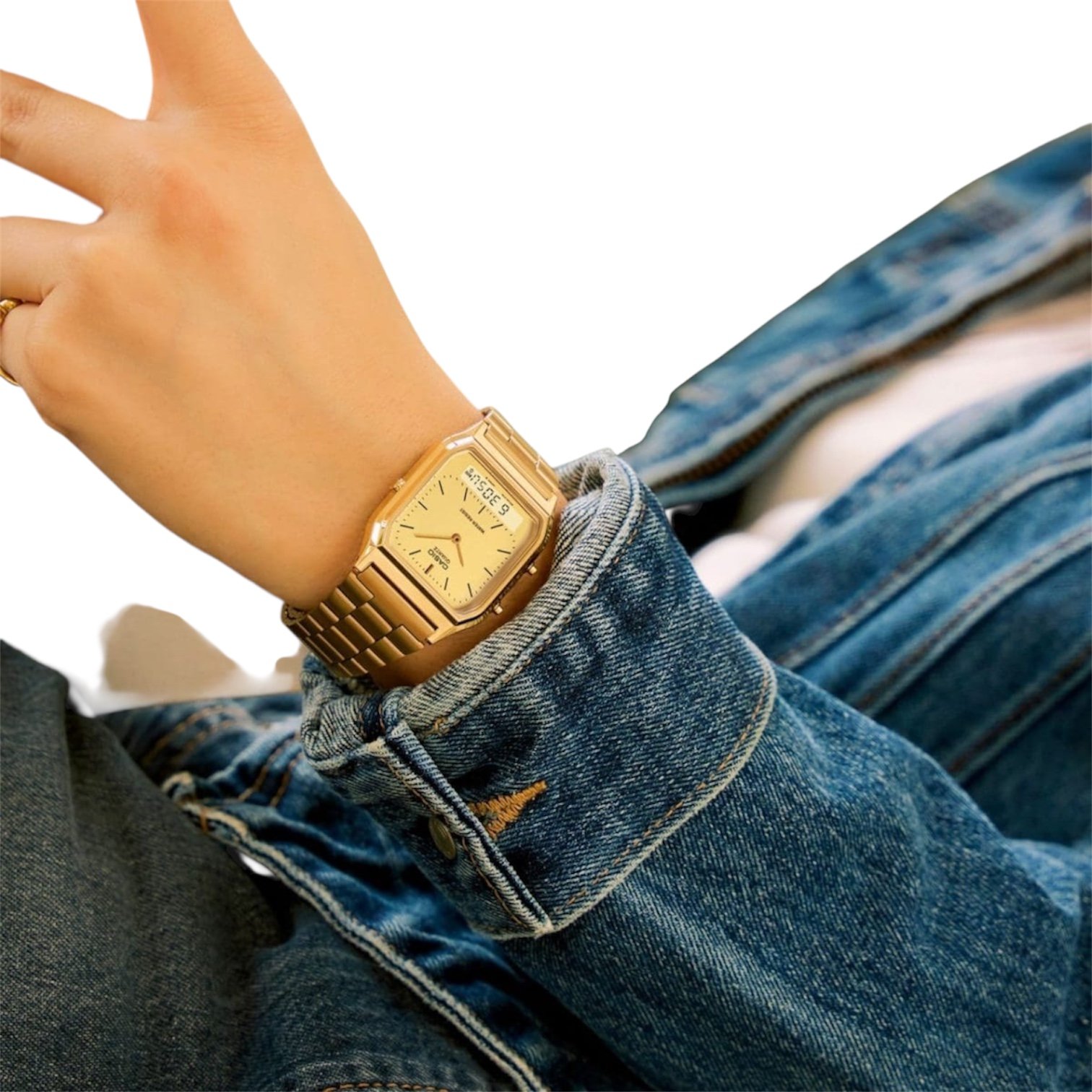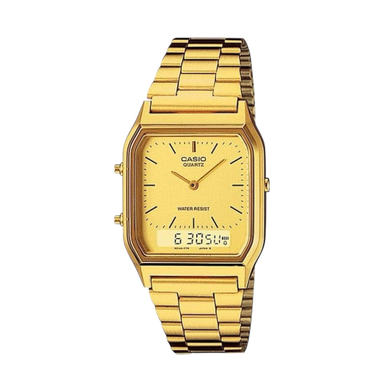 Gold Gold Unisex case with CASIO Unisex’s Analog-Digital Combination Gold Dial Watch – AQ-230GA-9D display, Dual time • 1/100-second stopwatch • Day and date display at 6 o’clock dial Gold mm case diameter, Square movement, 29.8 water resistant Vintage Analog-Digital Combination bracelet with Stainless Steel Band Adjustable Clas
